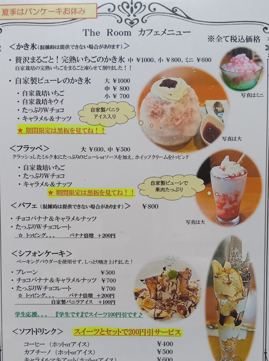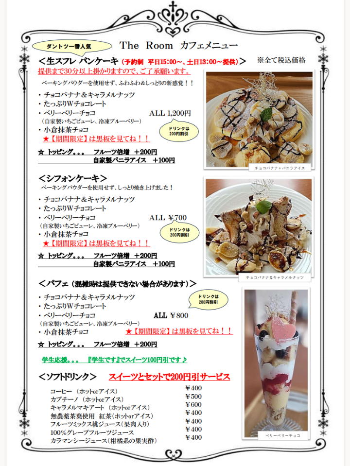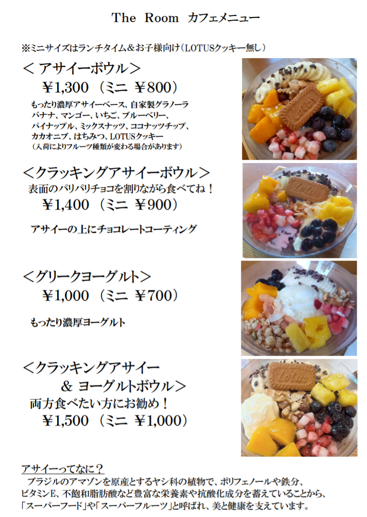 パンケーキ&アサイーボウルの店 カフェ The Room 近鉄富田駅前 Menu